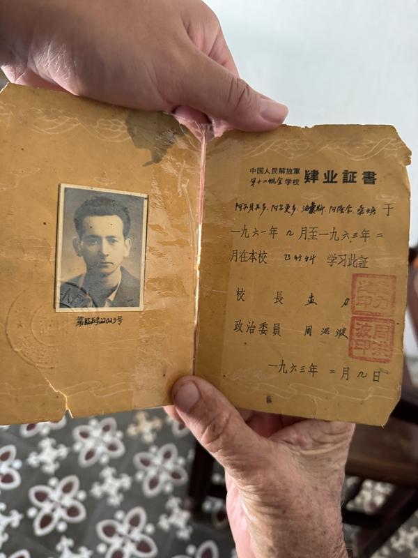 上面写着汉字:“中国人民解放军第十二航空学校肄业证书——阿尔贝尔多·阿尔曼多·海索斯·阿隆索·桑焕,于1961年9月至1963年2月在本校飞行科学习。校长,孟力。政治委员,周洪波。”证书用透明胶纸加固过,左页贴着他年轻时的照片。